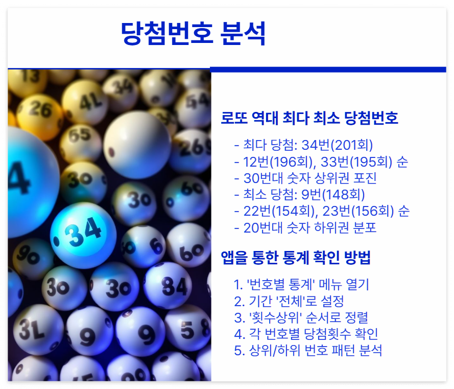1157회 로또 당첨결과를 분석해보니 역대 최다 당첨번호인 34번이 201회로 압도적인 기록을 보여주었고, 최소 당첨번호는 9번으로 148회에 그쳤습니다. 이런 장기 통계는 앞으로의 당첨 패턴을 예측하는데 중요한 지표가 될 수 있어요.