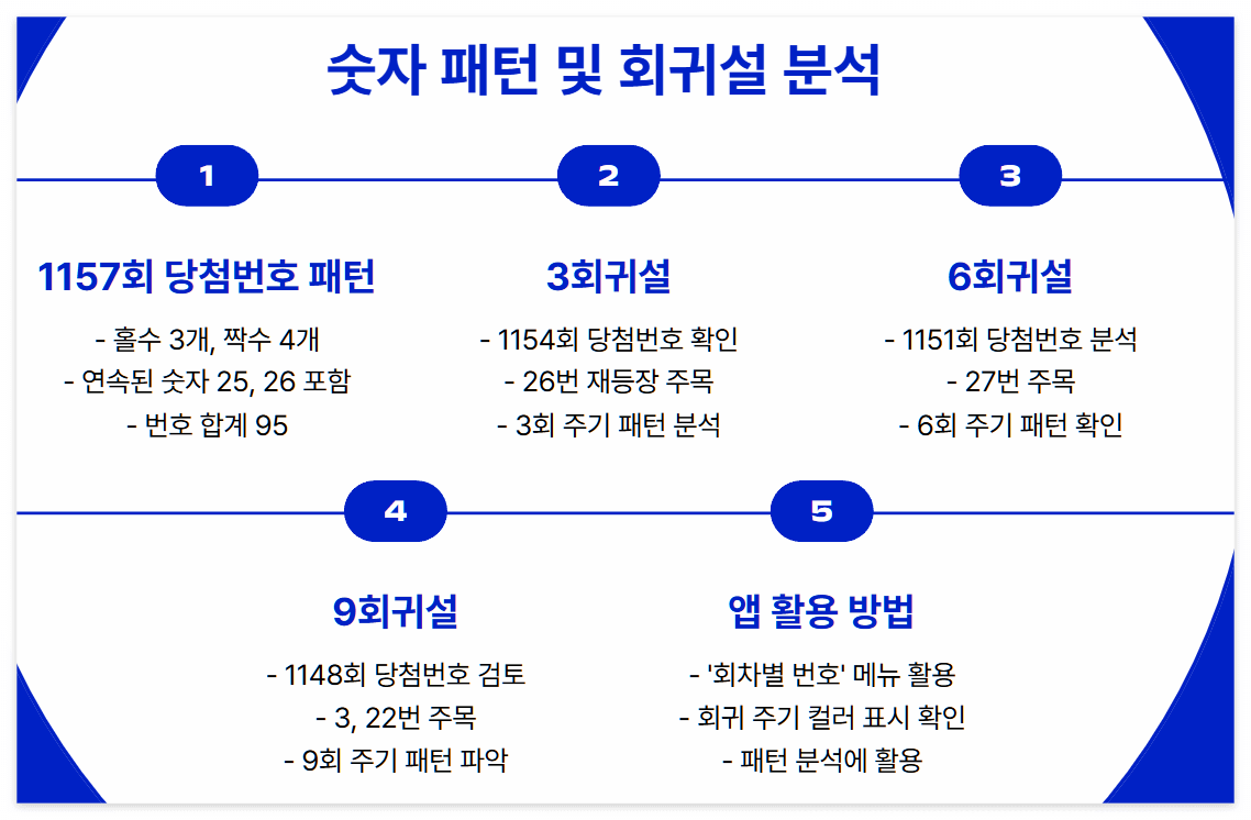 1157회 당첨번호를 세밀하게 분석해보면 홀수 3개(5, 7, 25), 짝수 4개(12, 20, 26, 28)의 패턴이 나타났습니다. 특히 연속된 숫자인 25, 26이 포함되어 있는데, 이런 연속 패턴은 2023년 이후 로또 당첨번호에서 자주 등장하는 특징이에요.