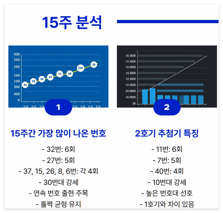 15주 데이터에서는 32번이 6회, 27번이 5회 등 기간별 변화가 구체적으로 나타납니다. 이러한 수치는 예상번호 조합의 신뢰도를 높여줍니다.