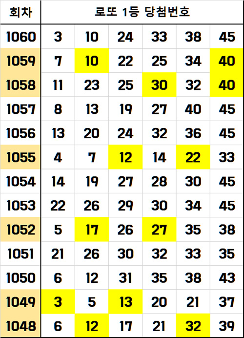 위 로또 1등 당첨번호 내역에서 1048회 ~ 1060회 로또번호를 분석했습니다.