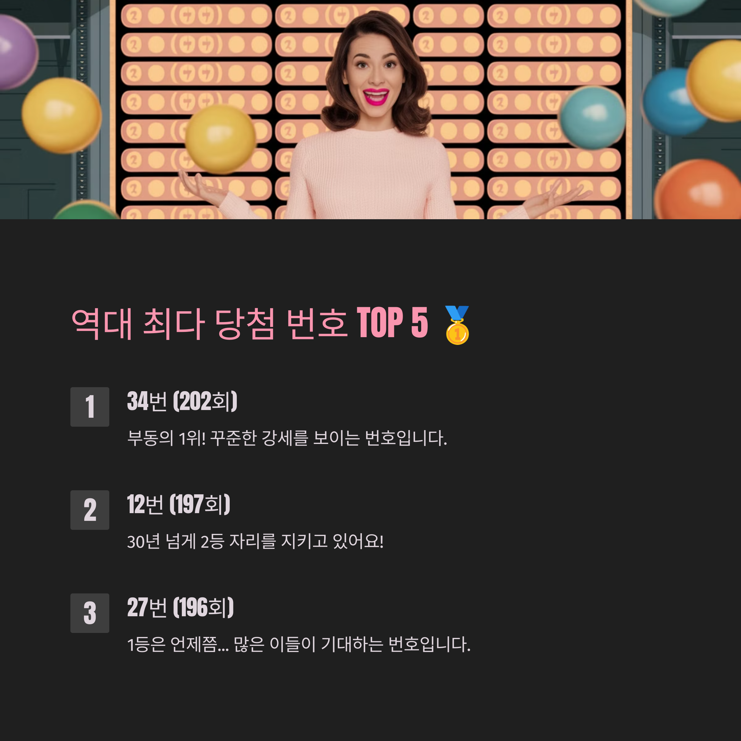 지금까지 로또 역대 최다/최소 당첨번호와 최근 주간별 통계를 분석하고, 이를 바탕으로 1163회 로또 예상번호를 선정하는 방법에 대해 알아보았습니다. 1162회 기준 역대 최다 당첨번호는 34번(202회), 최근 5주간 가장 많이 나온 번호는 20번(3회)입니다.