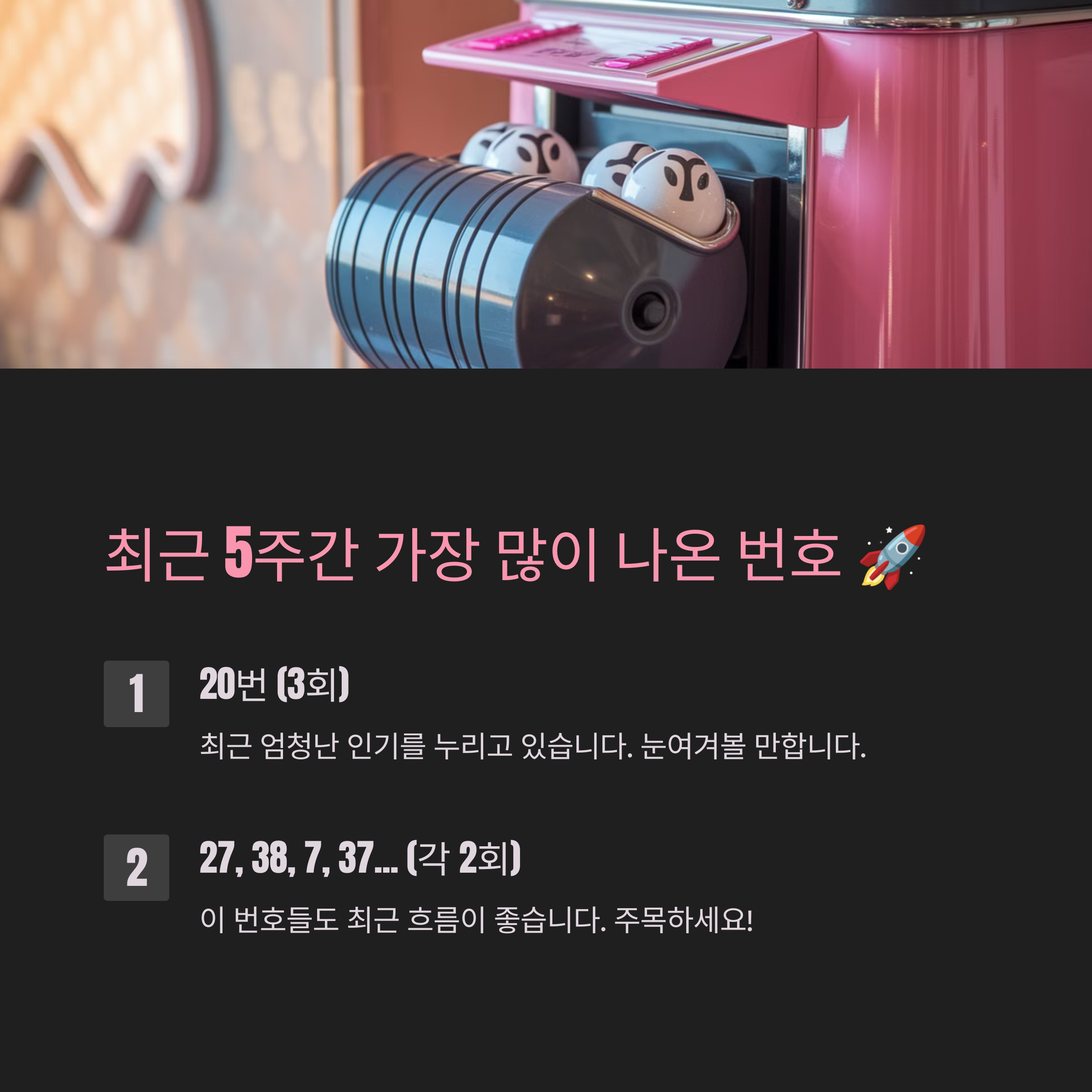 - 최근 5주간 다수 출현한 20번(3회), 27번(2회), 38번(2회), 37번(2회), 7번(2회)을 포함