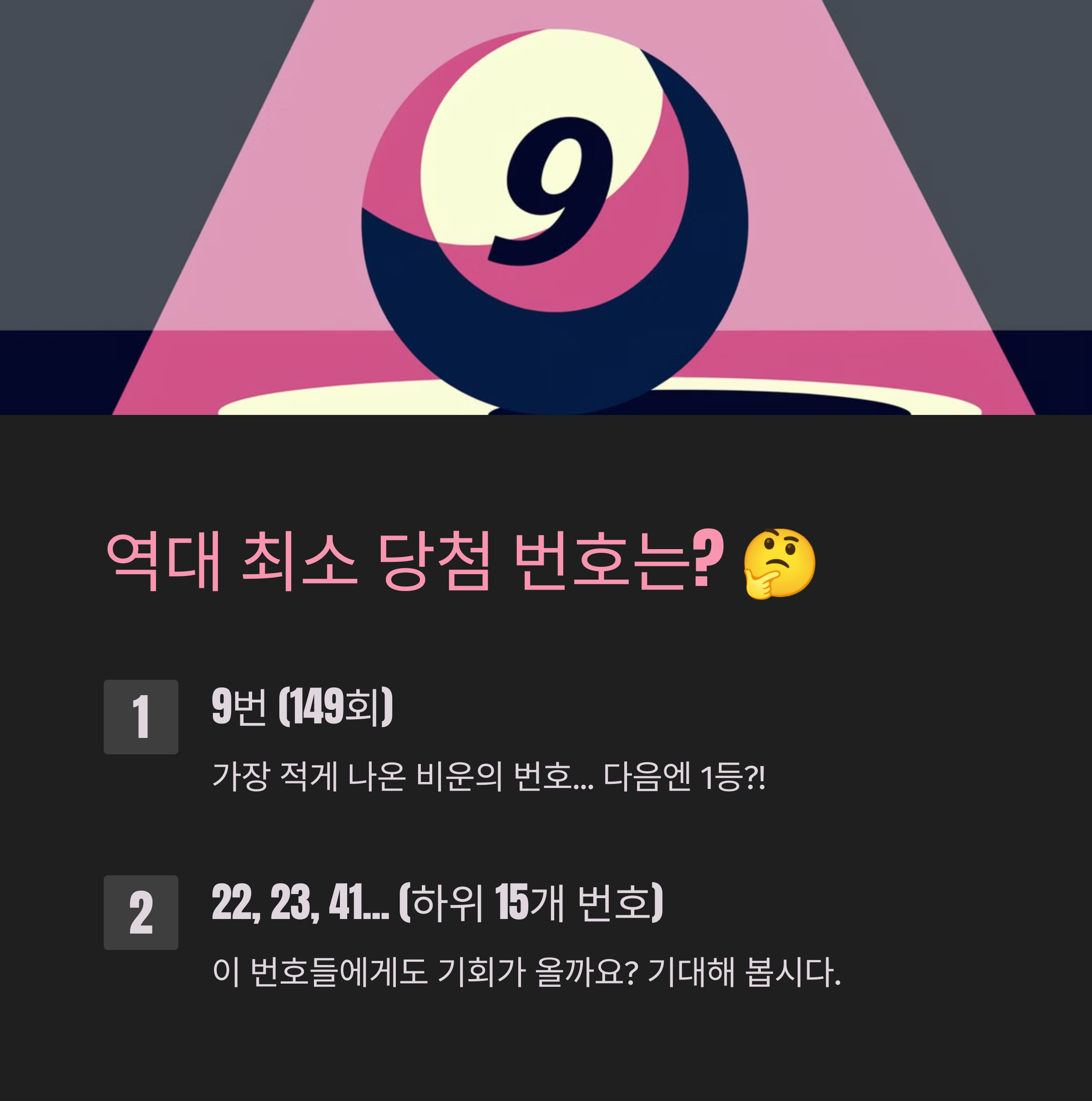 반면, 역대 최소 당첨번호는 9번으로 총 149회 당첨되었습니다. 역대 누적 당첨횟수 하위권 15개 번호는 9번(149회), 22번(155회), 23번(156회), 41번(158회), 29번(160회), 25번(162회), 28번(168회), 42번(169회), 5번(170회), 8번(171회), 32번(171회), 44번(179회), 30번(179회), 36번(179회), 2번(180회) 순으로 나타납니다.