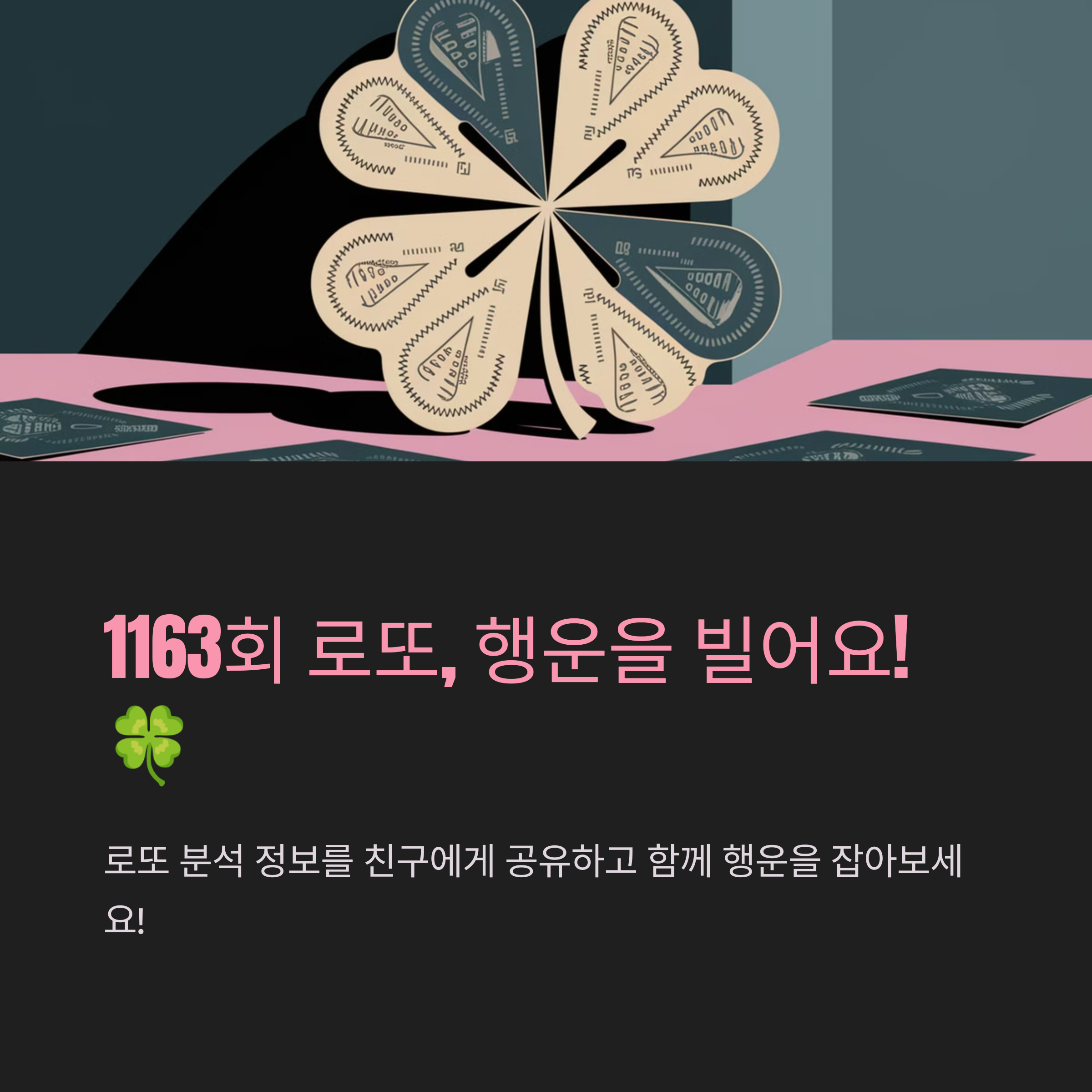 로또 당첨을 위한 절대적인 방법은 없지만, 통계적 접근과 체계적인 분석을 통해 당첨 가능성을 높일 수 있습니다. 이번 글에서 제안한 1163회 로또 예상번호 조합들은 다양한 통계 자료와 분석 방법을 바탕으로 선정한 것이므로, 참고하시어 자신만의 로또 전략을 세워보시기 바랍니다.
