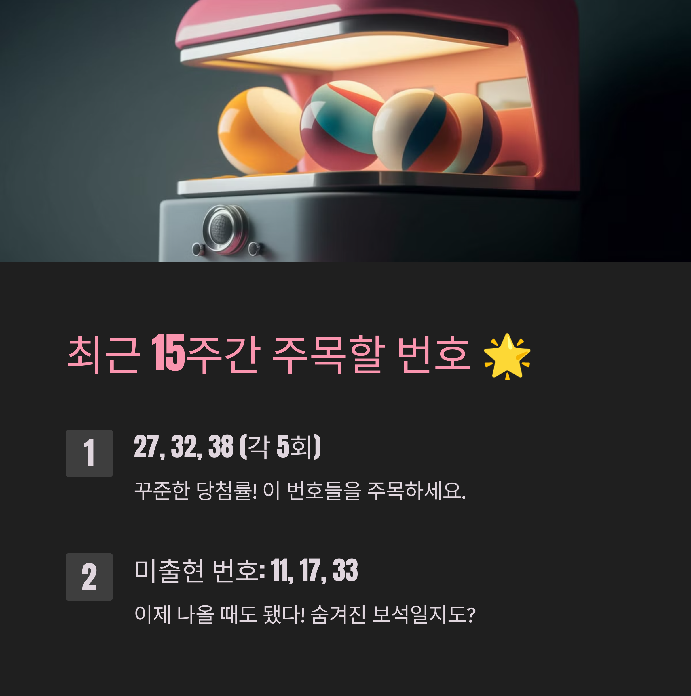 좀 더 넓은 범위인 최근 15주 데이터를 분석해보면, 5회씩 당첨된 27번, 32번, 38번과 4회씩 당첨된 37번, 7번, 13번, 20번, 39번, 8번, 25번, 9번이 강세를 보이고 있습니다. 이 번호들은 상대적으로 당첨 확률이 높다고 볼 수 있습니다.