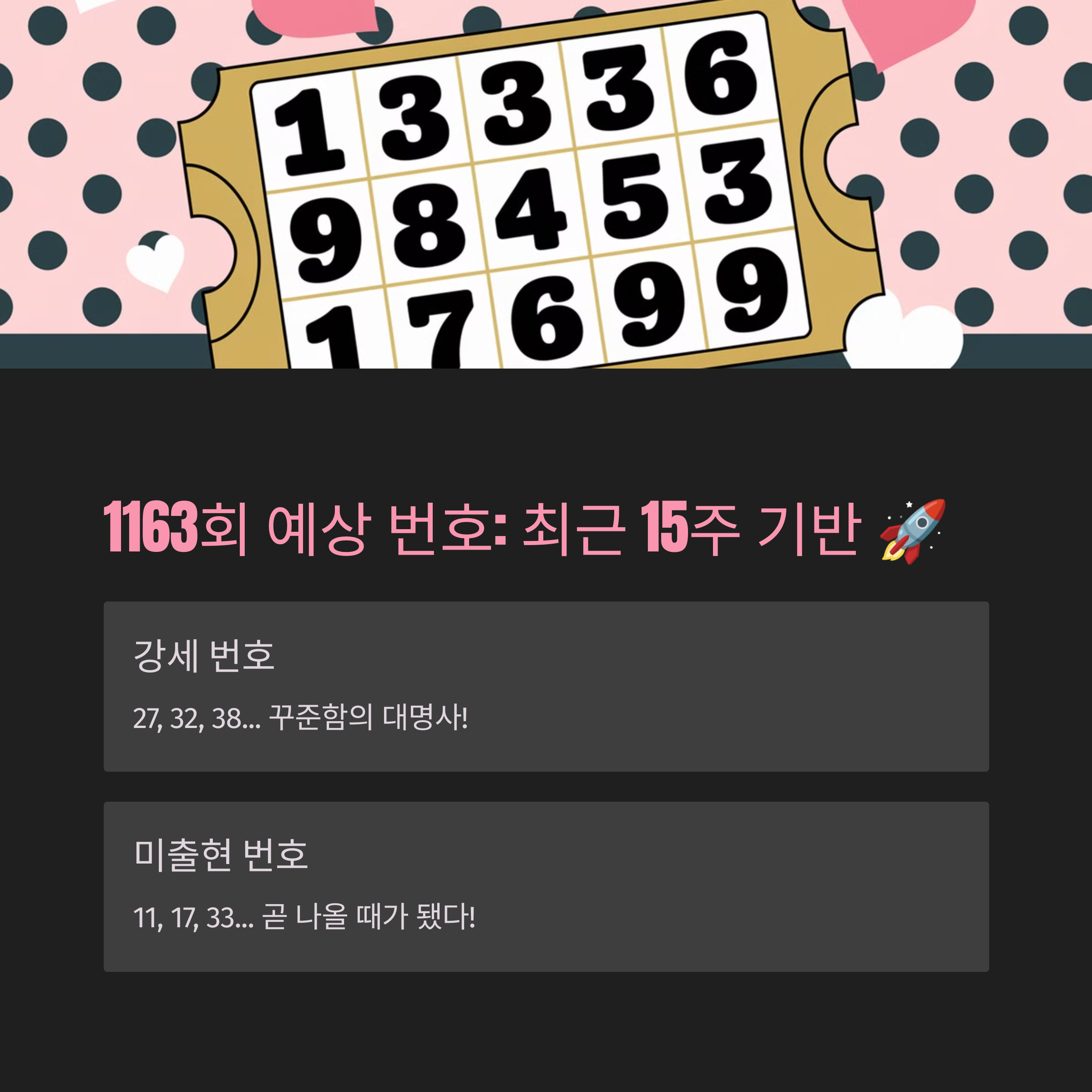 - 역대 당첨 횟수 상위권이면서 최근 15주 미출현한 17번, 33번 포함