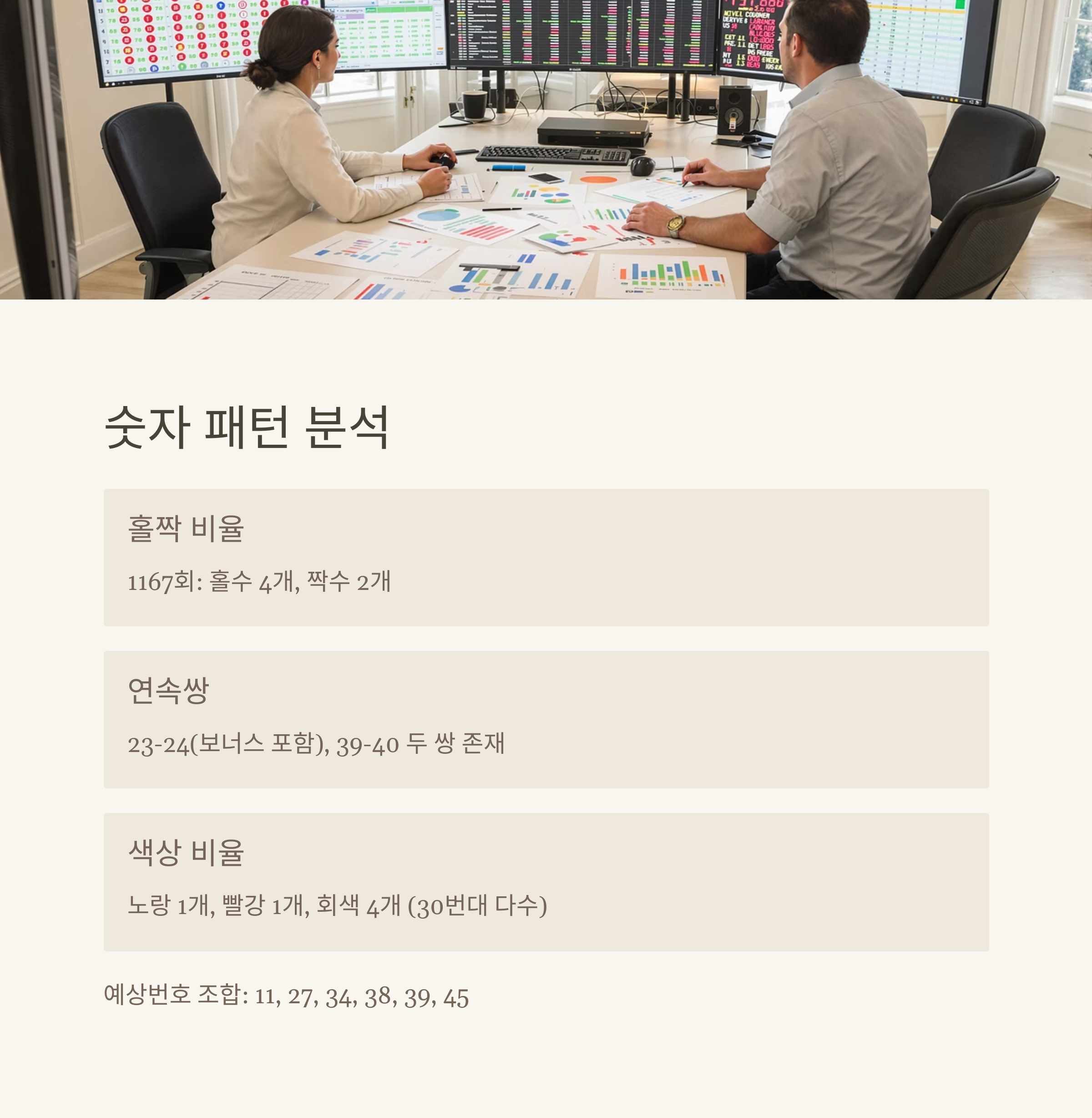 이러한 패턴을 고려해 1168회 예상번호로 11, 27, 34, 38, 39, 45를 제안합니다. 이 조합은 최근 15주간 높은 당첨 빈도를 보인 27번, 38번, 39번과 오랫동안 미출현 상태인 11번, 그리고 역대 최다 당첨번호인 34번을 포함하고 있습니다.