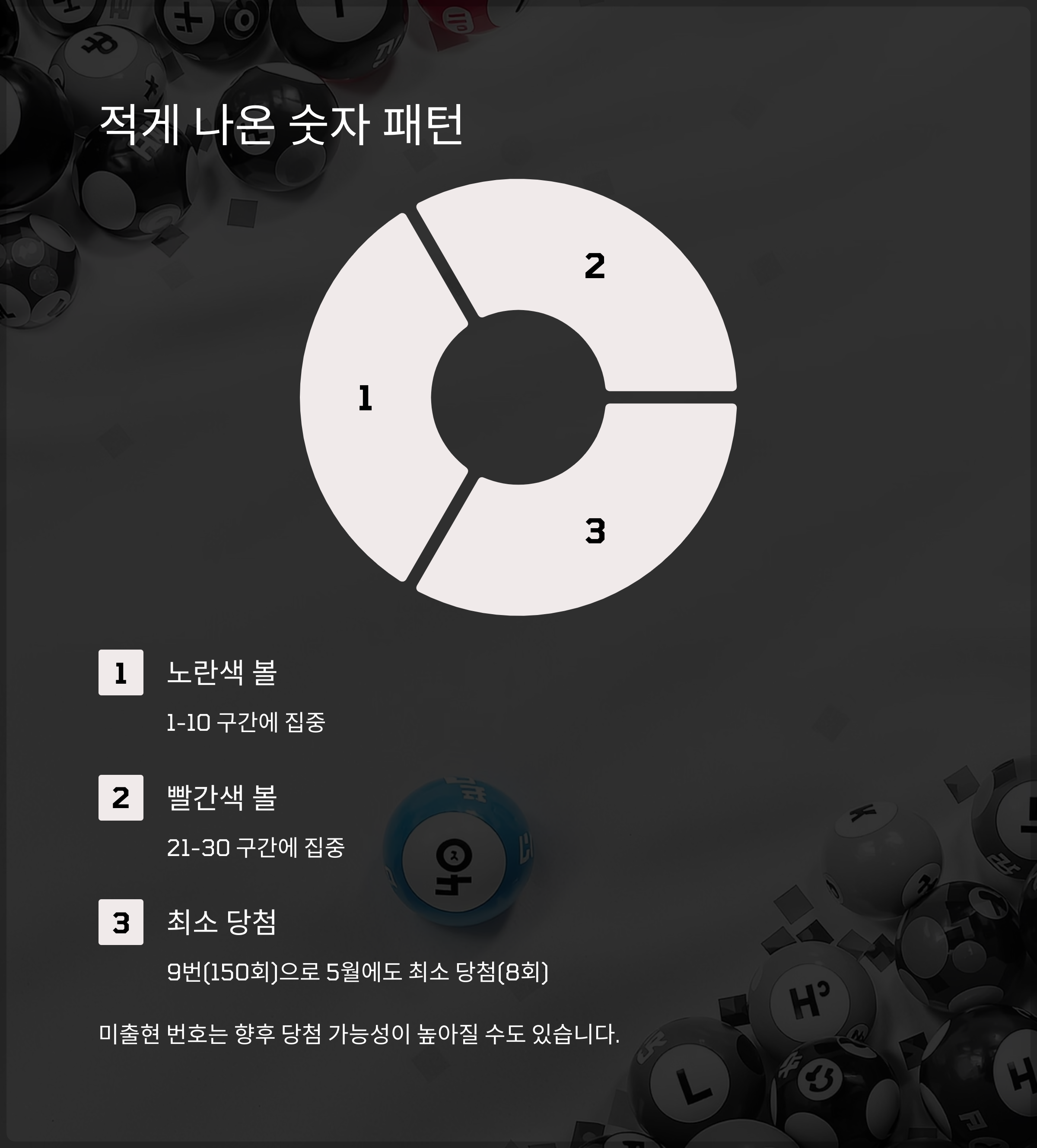 이런 적게 나온 숫자들의 패턴을 살펴보면, 대체로 1-10 구간(노란색 볼)과 21-30 구간(빨간색 볼)에 집중되어 있는 경향이 있습니다. 특히 9번은 5월 통계에서도 가장 적게 나온 숫자(8회)로 기록되었습니다.