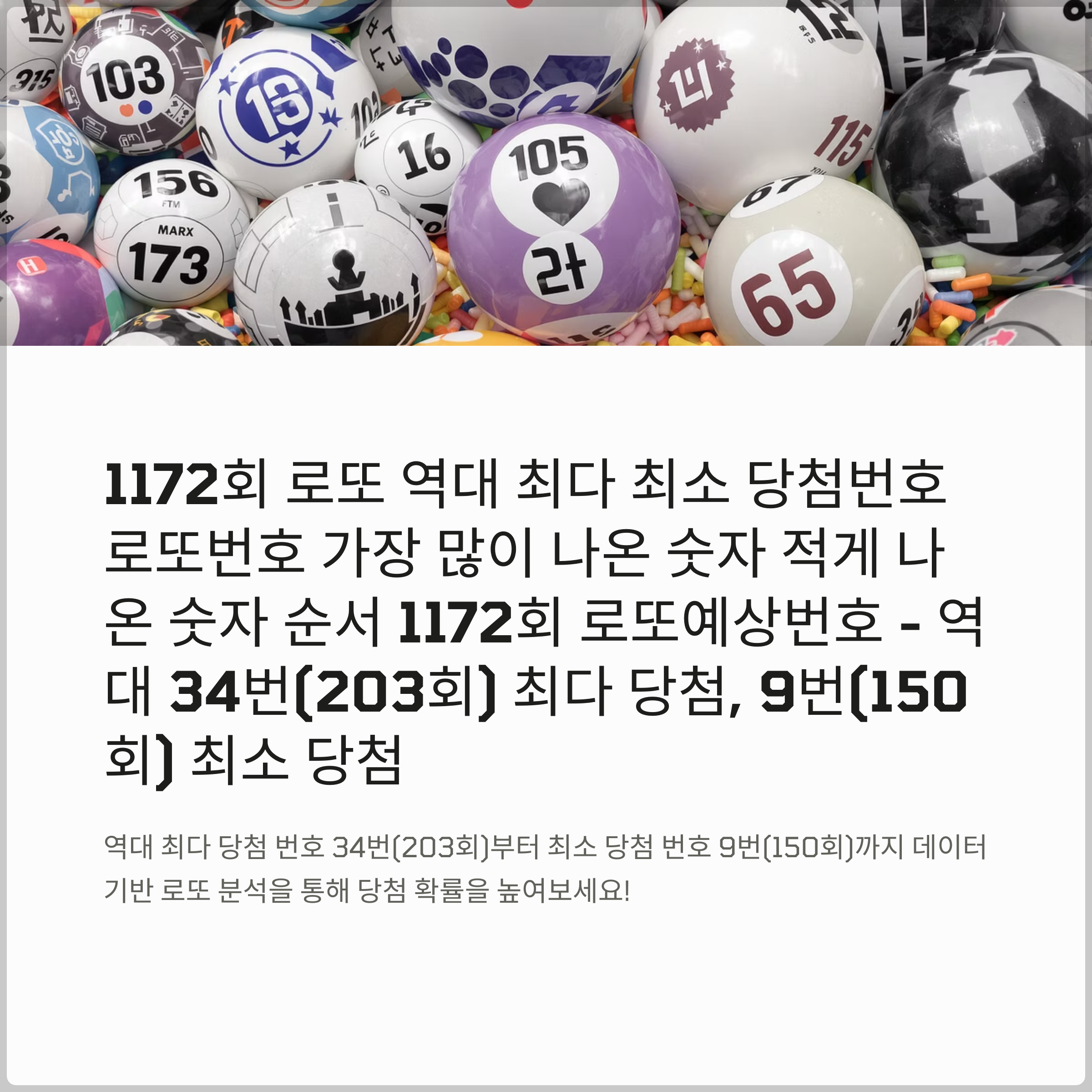 1172회 로또 예상번호를 찾기 위해 로또 역대 최다 최소 당첨번호와 로또번호 가장 많이 나온 숫자를 확인해보니 흥미로운 패턴이 발견되었습니다. 역대 가장 많이 당첨된 번호는 34번으로 무려 203회나 출현했으며, 가장 적게 나온 숫자는 9번으로 150회만 등장했습니다.