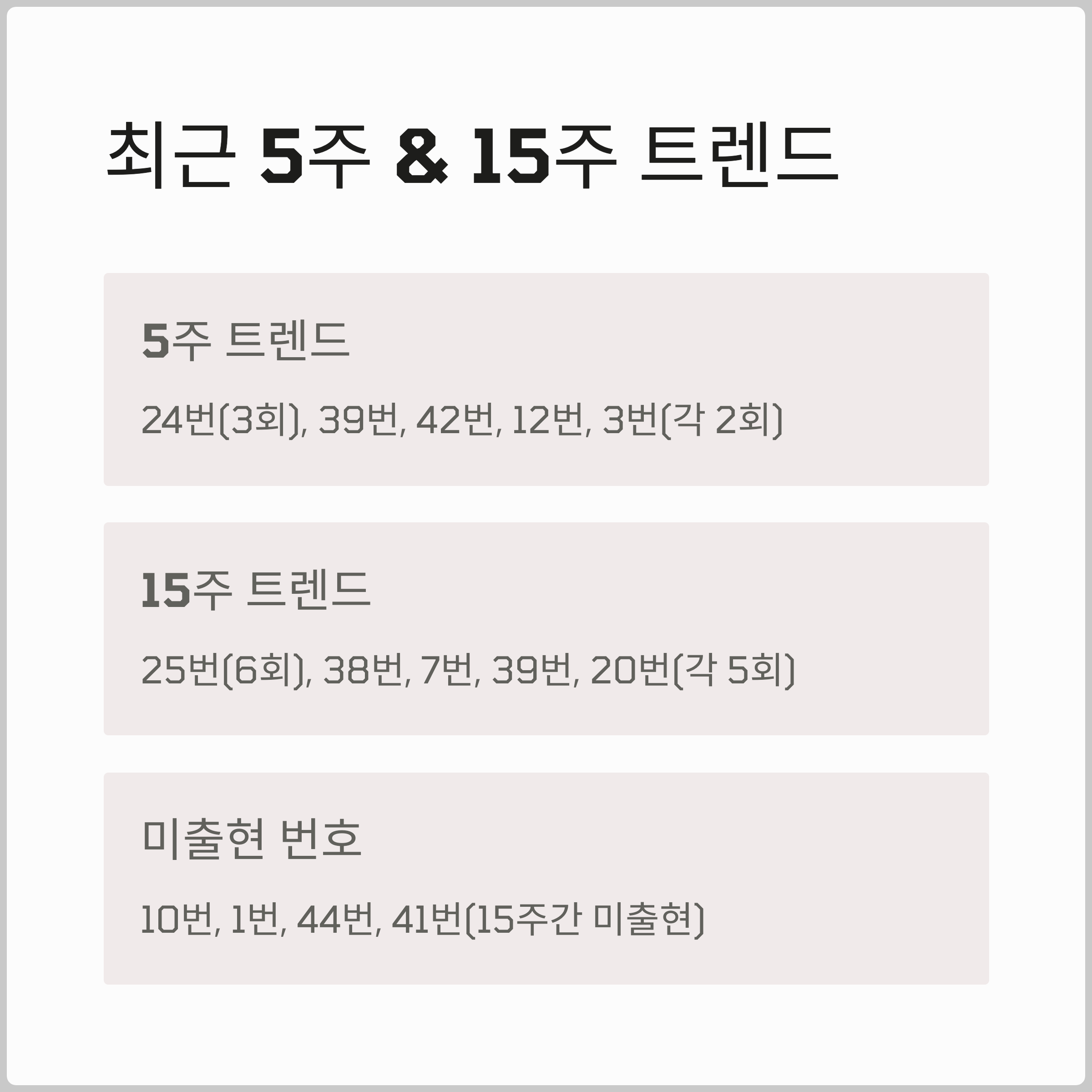 15주간 한 번도 등장하지 않은 10번, 1번, 44번, 41번도 주목할 필요가 있습니다. 특히 41번은 역대 통계에서도 적게 나온 번호(158회)이기 때문에 피하는 것이 좋을 수 있습니다.