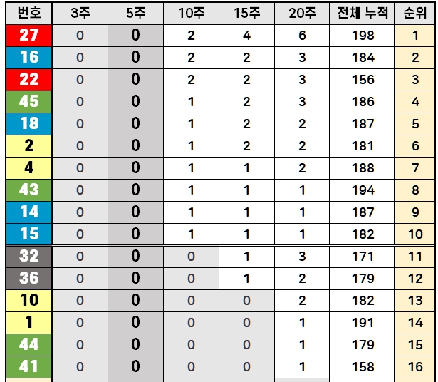 최근 5주간 미출현 번호를 살펴보면, 27번, 16번, 22번, 45번, 18번, 2번 등 총 16개의 번호가 있습니다. 10주간으로 확장하면 32번, 36번, 10번, 1번, 44번, 41번이 한 번도 출현하지 않았습니다.