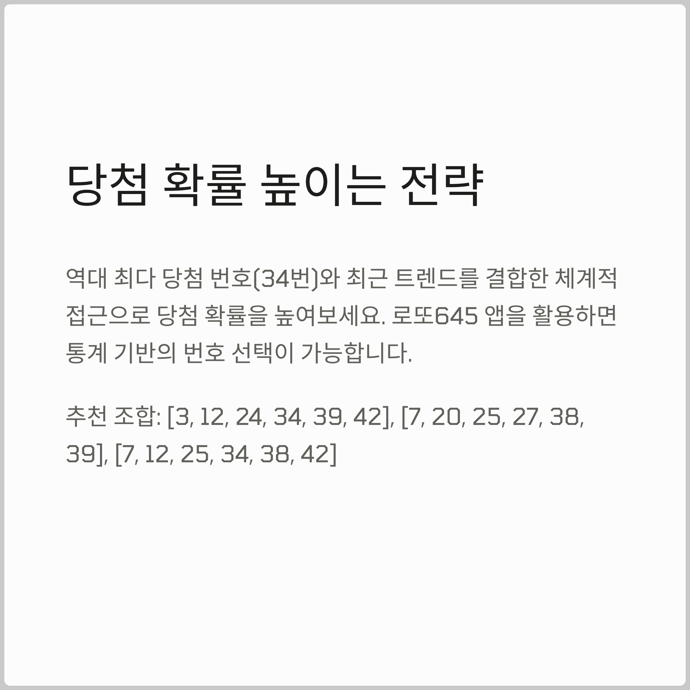 이런 방식으로 앱을 활용한 결과, 저는 6개월 동안 4등 5번, 5등 다수의 성과를 올릴 수 있었습니다. 물론 1등은 아직 경험하지 못했지만, 체계적인 접근이 가능해졌습니다.