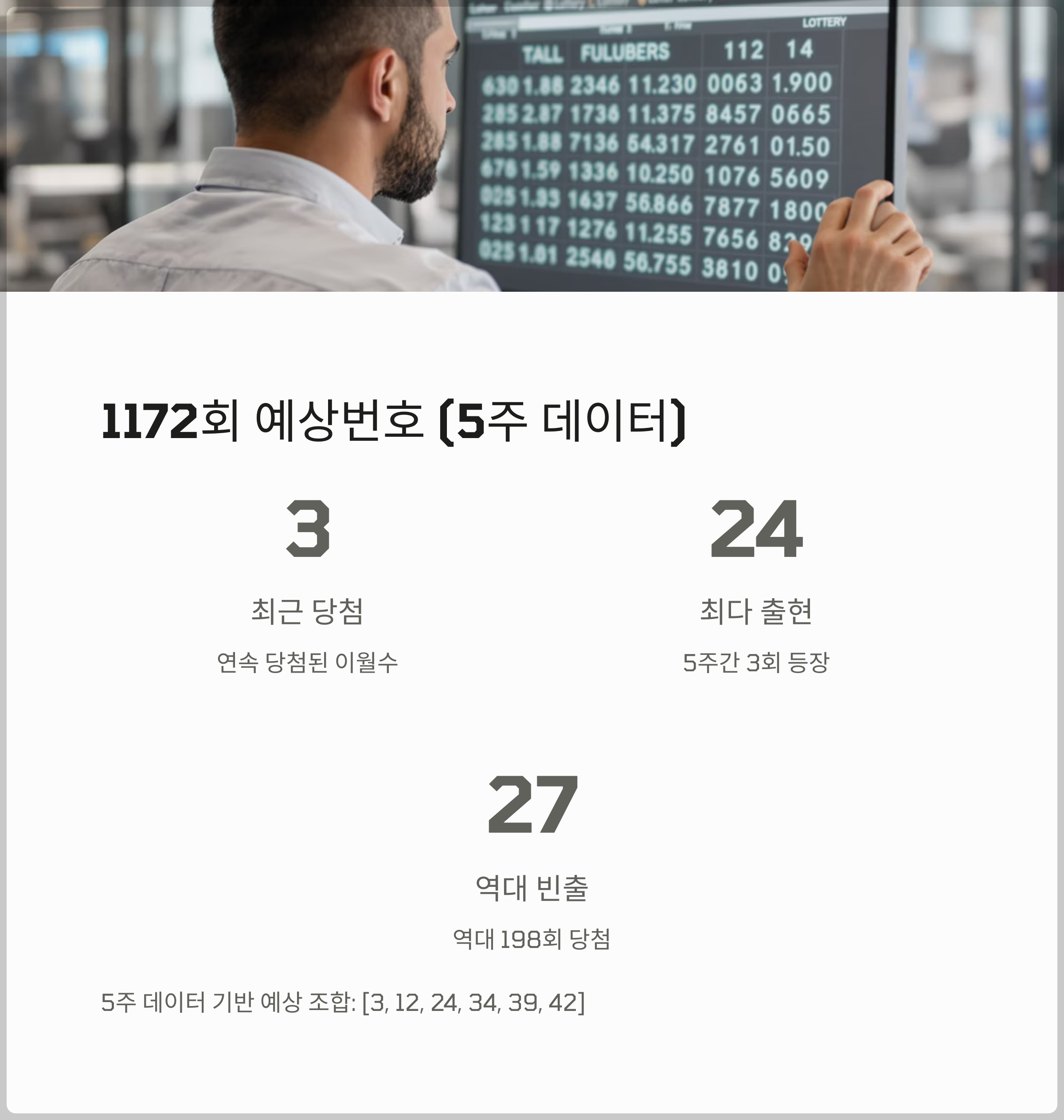 최근 5주 데이터를 기반으로 1172회 로또 예상번호를 분석해보겠습니다. 5주간 가장 많이 등장한 24번(3회)과 3번, 12번, 39번, 42번(각 2회)을 주목할 필요가 있습니다.