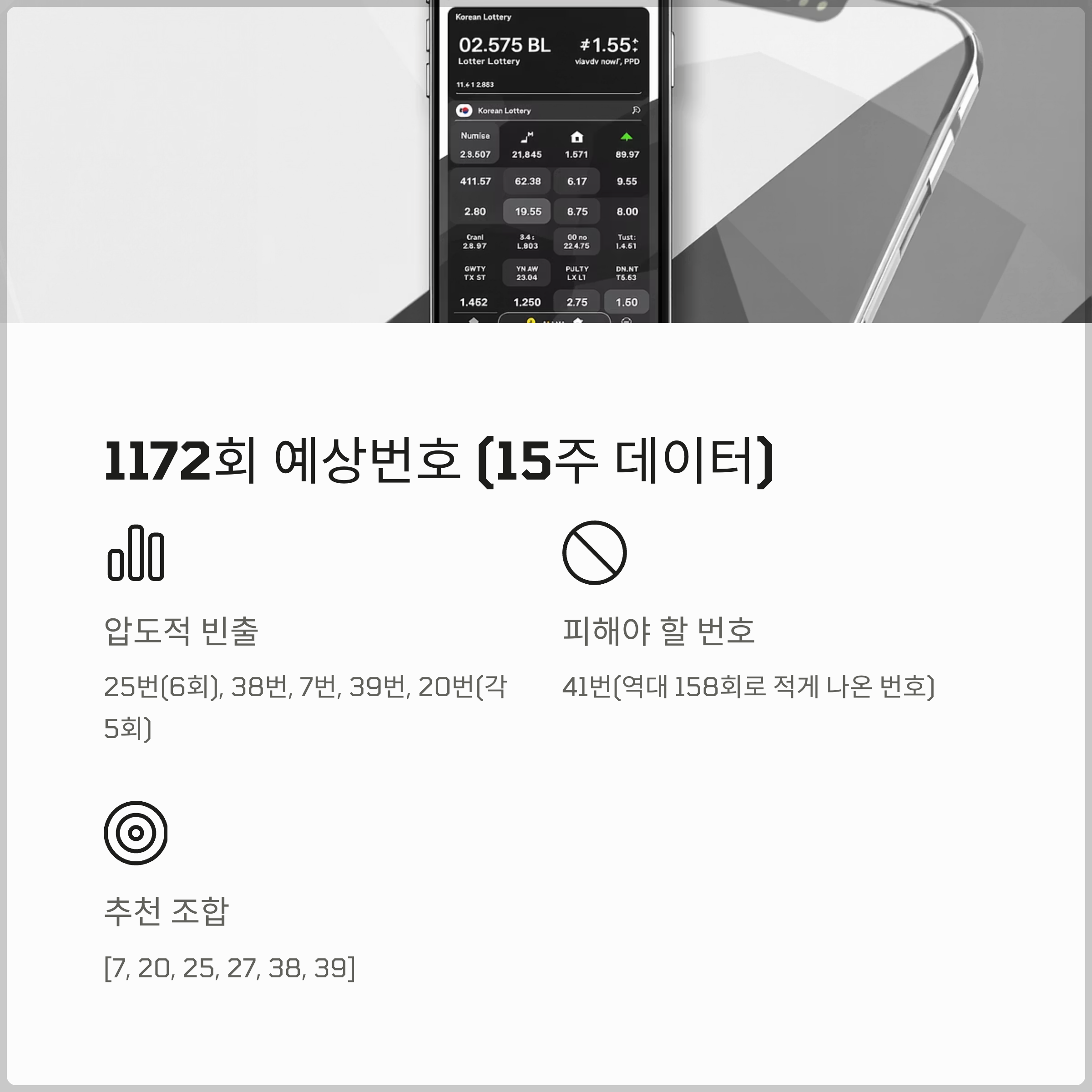 15주 데이터를 기반으로 한 예상번호 조합으로는 자주 등장한 번호들 중 25, 38, 7, 39, 20과 역대 많이 나온 27번을 포함한 [7, 20, 25, 27, 38, 39]를 제안합니다.