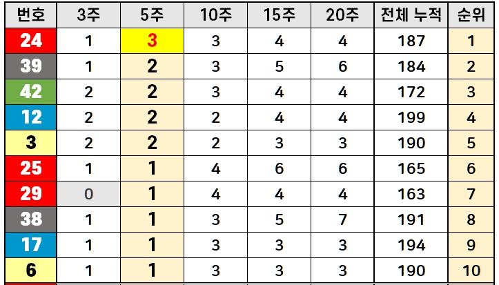 15주 데이터로 확장해 보면, 25번이 6회로 압도적인 출현 빈도를 보였고, 38번, 7번, 39번, 20번이 각각 5회씩 등장했습니다. 27번, 12번, 24번, 42번, 28번, 29번은 4회씩 출현했습니다.