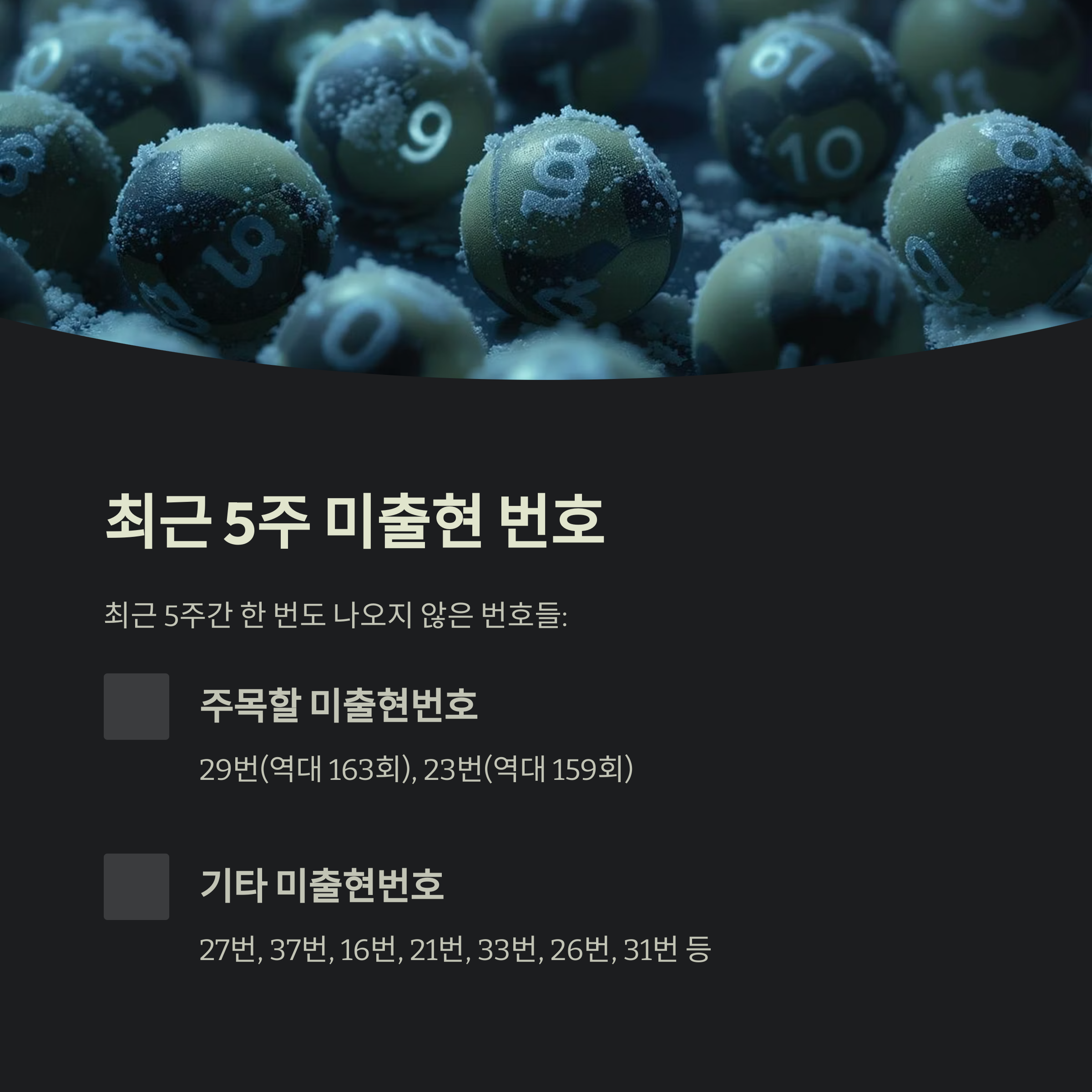 최근 5주간 미출현번호들을 살펴보면 흥미로운 패턴이 드러납니다.