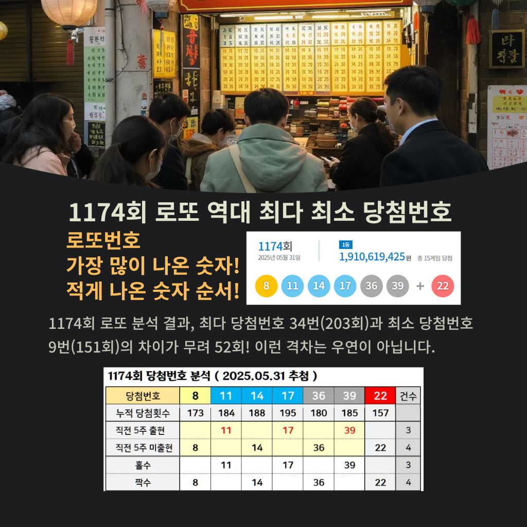 1174회 로또 역대 최다 최소 당첨번호 로또번호 가장 많이 나온 숫자 적게 나온 숫자 순서 1175회 로또예상번호, 분석 결과 최다 34번 203회 최소 9번 151회 확인
