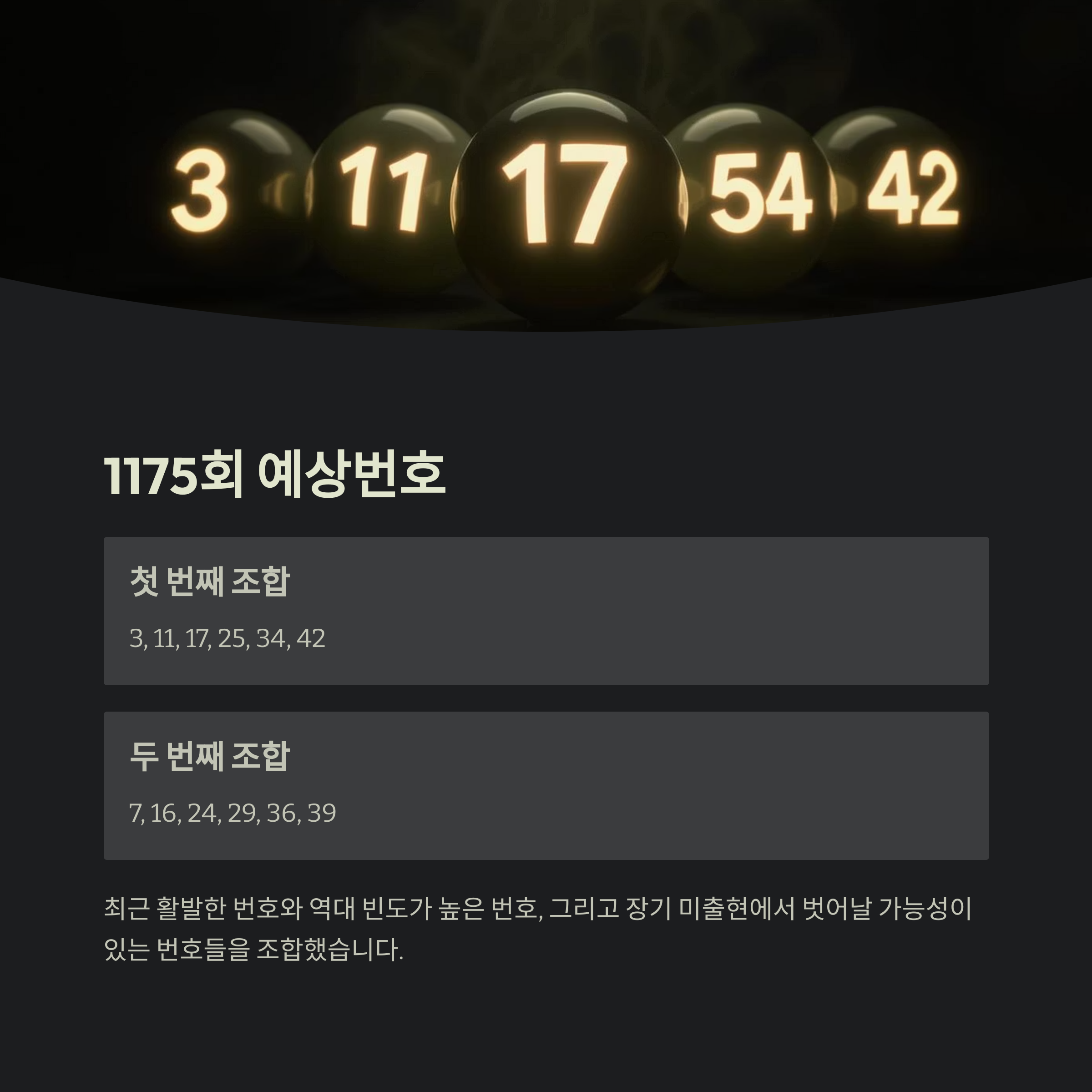 지금까지의 분석을 종합해서 1175회 예상번호를 제시해보겠습니다. 첫 번째 조합은 3, 11, 17, 25, 34, 42입니다. 이는 최근 5주간 활발한 번호 3개(3, 11, 17)와 15주간 안정적인 번호 2개(25, 34), 그리고 역대 빈도가 높은 42번을 조합한 것입니다.
