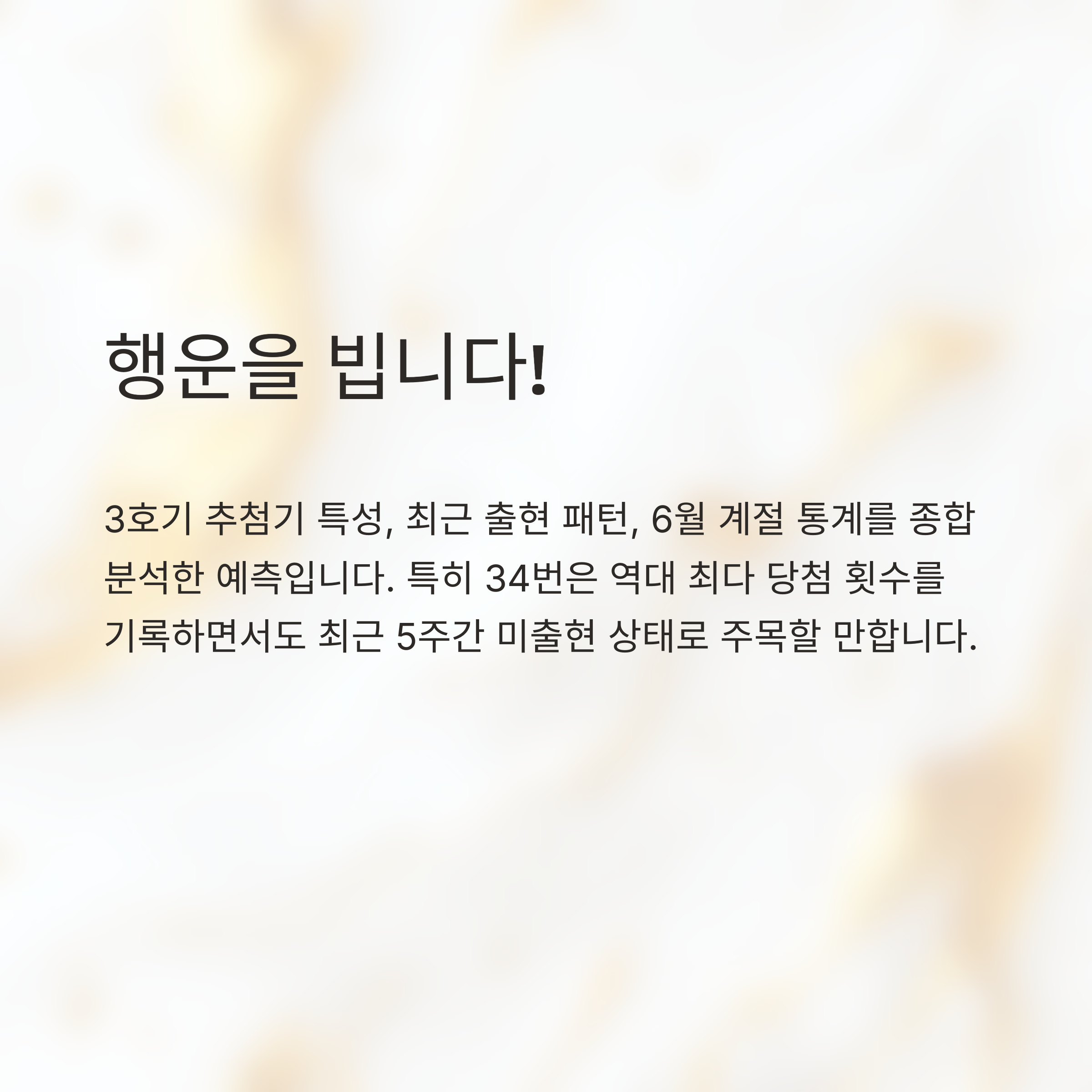 이 조합은 6월 계절 통계와 미출현 패턴을 균형있게 반영한 조합입니다.