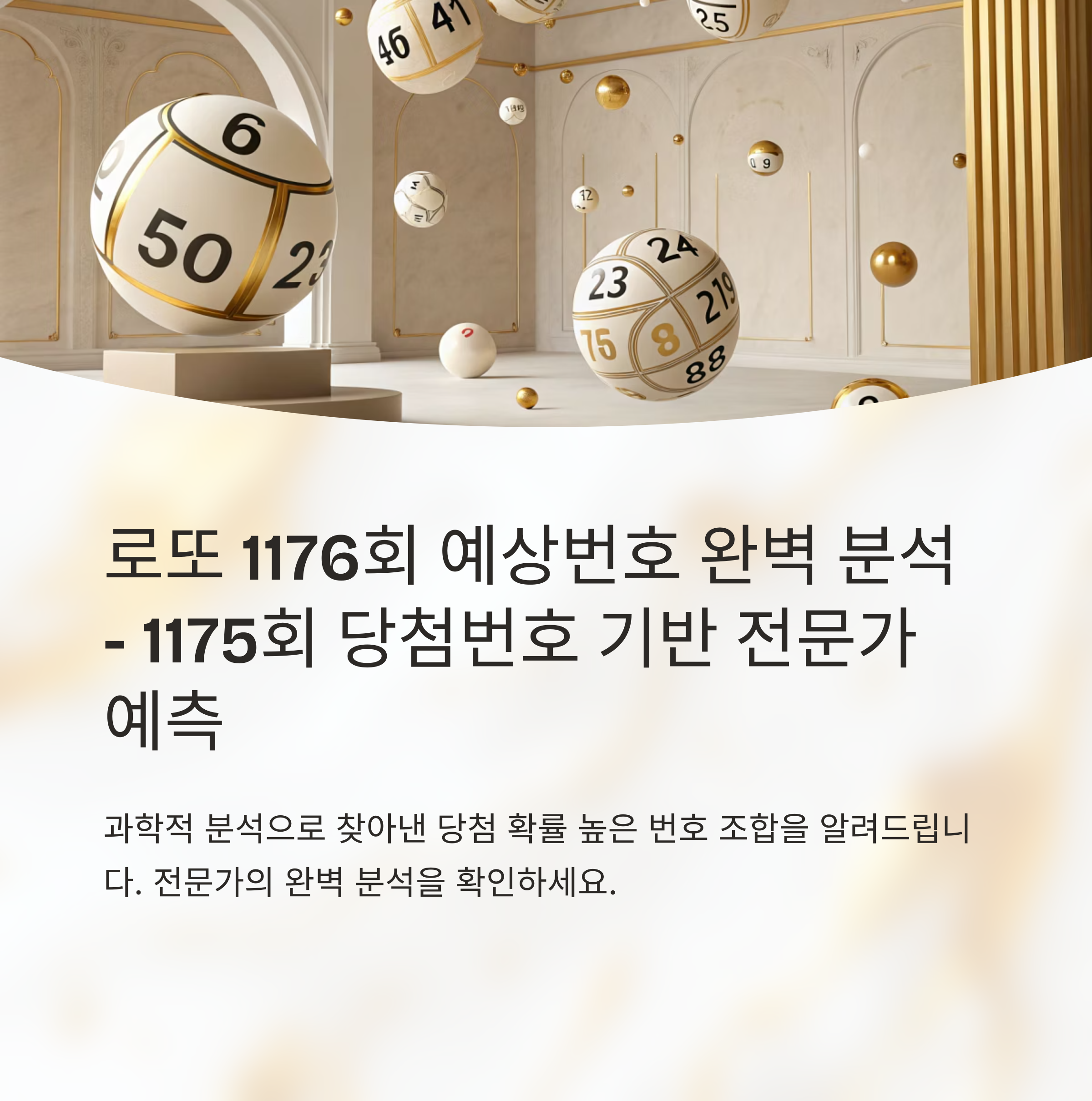 로또 1176회 예상번호를 찾고 계신가요? 2025년 6월 14일 추첨 예정인 1176회 로또 예상번호를 과거 데이터와 통계 분석을 통해 전문적으로 예측해드립니다. 로또 1175회 당첨번호 3, 4, 6, 8, 32, 42 + 보너스 31번 결과를 바탕으로 한 과학적 분석을 통해 가장 유력한 로또번호 조합을 제시합니다.