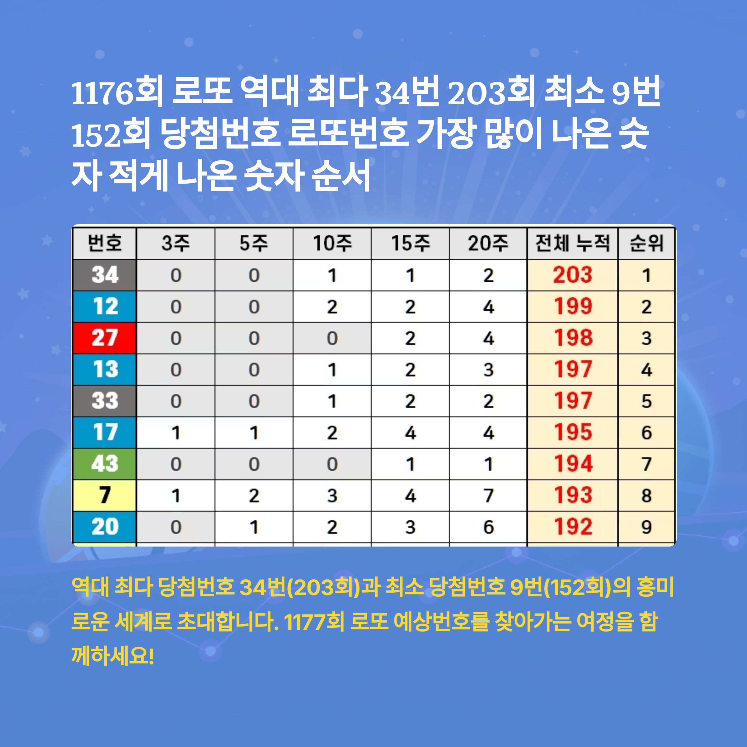 1176회 로또 역대 최다 34번 203회 최소 9번 152회 당첨번호 로또번호 가장 많이 나온 숫자 적게 나온 숫자 순서 1177회 로또예상번호
