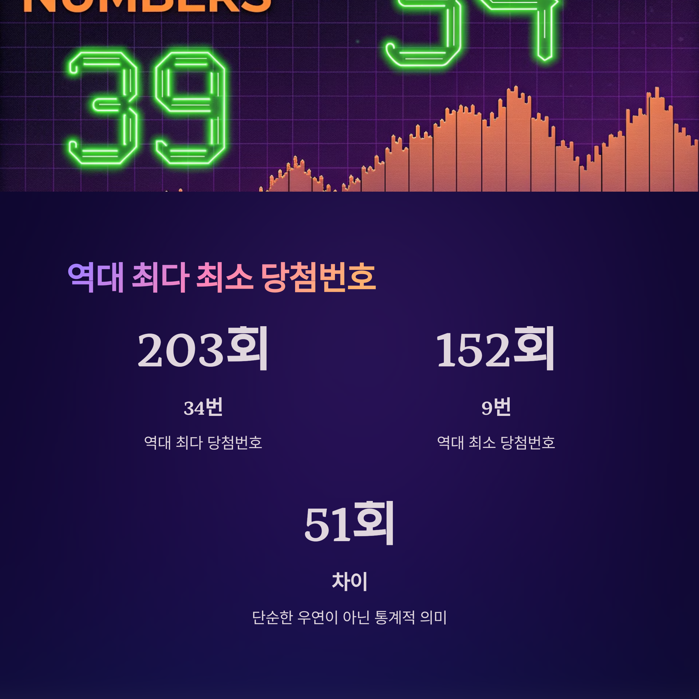 반면 역대 최소 당첨번호인 9번은 152회에 그쳐 최다 당첨번호와 51회의 차이를 보였습니다. 이 차이는 단순한 우연의 일치로 보기에는 너무 큰 격차입니다.